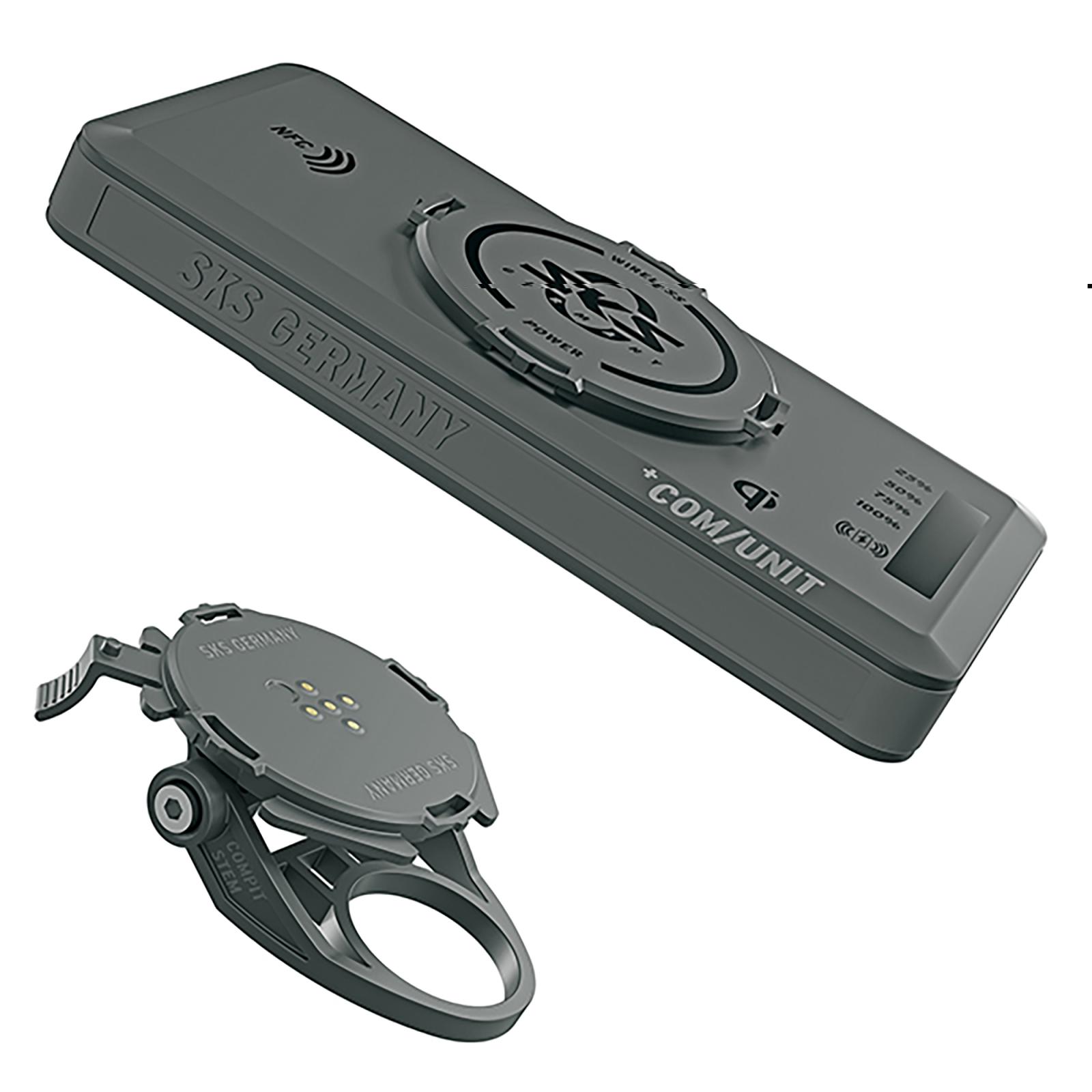 Das Plus an Energie! COMPIT/STEM+ zur Vorbau-Montage besteht aus einer Smartphone Halterung und Powerbank mit integriertem NFC-Chip. Jedes Mobilgerät, das mit kabelloser Ladefunktion ausgestattet ist, kann mit der +COM/UNIT verbunden und unterwegs geladen werden. Mit einem Dreh lässt sich das Smartphone dank der Oversize-Bajonettaufnahme horizontal oder vertikal anbringen.